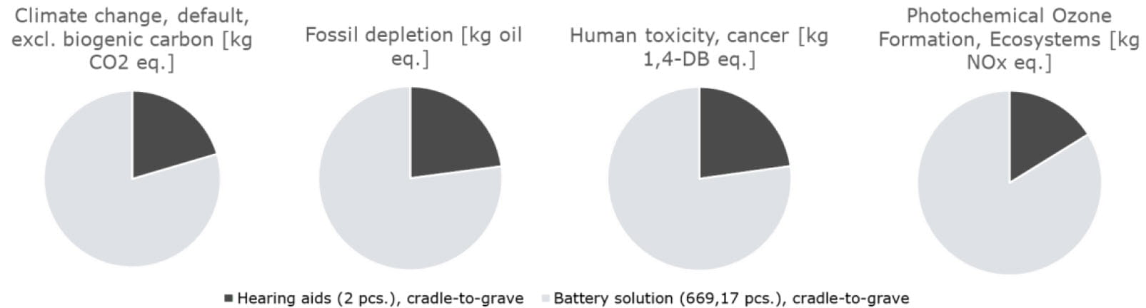 - Den oppladbare høreapparatløsningen sparer miljøpåvirkninger i alle de 18 forskjellige kategoriene, inkludert klimaendringer, dannelse av fine partikler, fossil nedbryting, ferskvannsforbruk, ferskvannsøkotoksisitet, human toksisitet – kreft, human toksisitet – ikke-kreft, ioniserende stråling, landbruk, marin økotoksisitet, marin eutrofikasjon, metallnedbryting, fotokjemisk ozondannelse, økosystemer, fotokjemisk ozondannelse, human helse, stratosfærisk ozonnedbryting, terrestrisk forsuring og terrestrisk økotoksisitet.