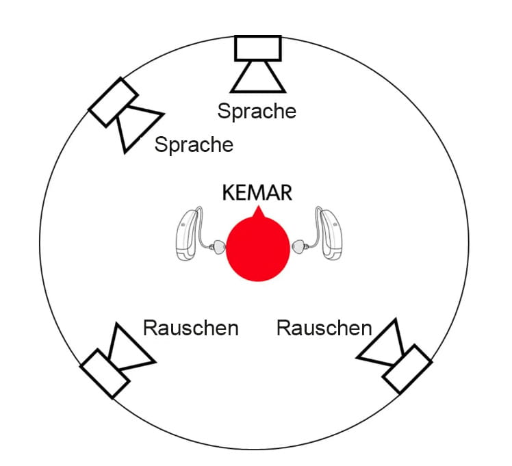 In dieser Studie haben die Forscher Signia IX mit RTCE bewertet. Durch die Aufzeichnung der Signale in den Ohren einer KEMAR-Puppe und die Anwendung einer fortschrittlichen Analysemethode konnten wir den SNR an der Ausgangsseite der Hörgeräte messen. So sah der Aufbau aus: