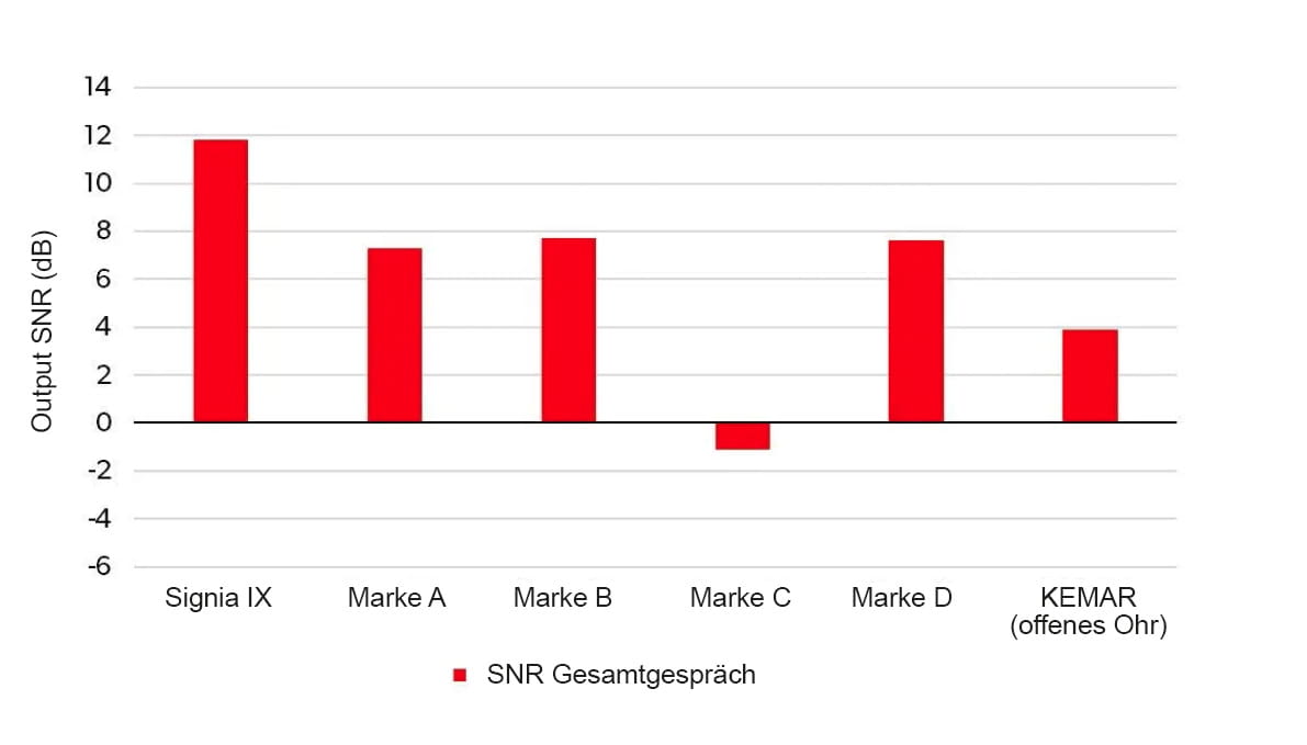 Diese neue Hörgerätetechnologie erreicht dies durch eine signifikante Verbesserung des Signal-Rausch-Verhältnisses (SNR = signal-to-noise ratio) bei einem simulierten Gruppengespräch im Störgeräusch.