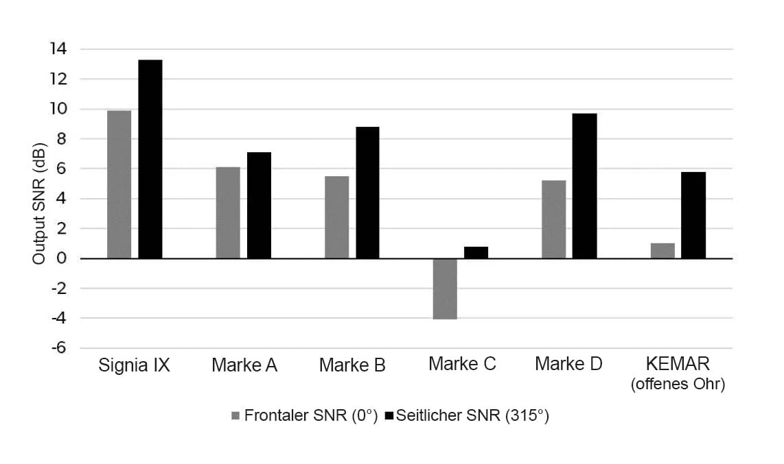 Zum Beispiel war der Ausgangs-SNR für Sprecher, die sich vor dem Hörgeräteträger befanden, 3,8 dB höher als der beste Mitbewerber. Bei Sprechern, die sich seitlich befinden, war Signia IX um 3,6 dB besser.