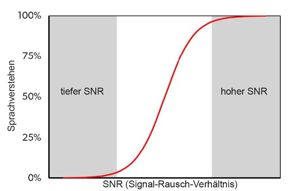 Das Diagramm zeigt eine ideale Leistungs-Intensitäts-Funktion, die verdeutlicht, dass der Zusammenhang zwischen SNR und Sprachverständnis nicht linear ist. Während SNR-Änderungen bei aussergewöhnlich niedrigen oder sehr hohen SNRs kaum Auswirkungen haben, könnte eine SNR-Änderung von 4 dB um den steilen Teil der Funktion theoretisch zu einer Verbesserung des Sprachverständnisses um 40-60 % führen.