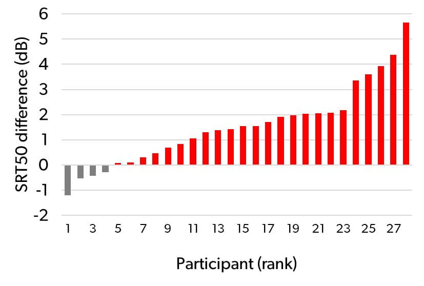 In einer Reihe von technischen, objektiven Messungen und mit Hilfe der Hagerman-Phasenumkehrmethode wurde der Ausgangs-SNR verschiedener Hörgeräte ermittelt – und damit die Fähigkeit, das Verstehen in Gruppengesprächssituation zu verbessern.