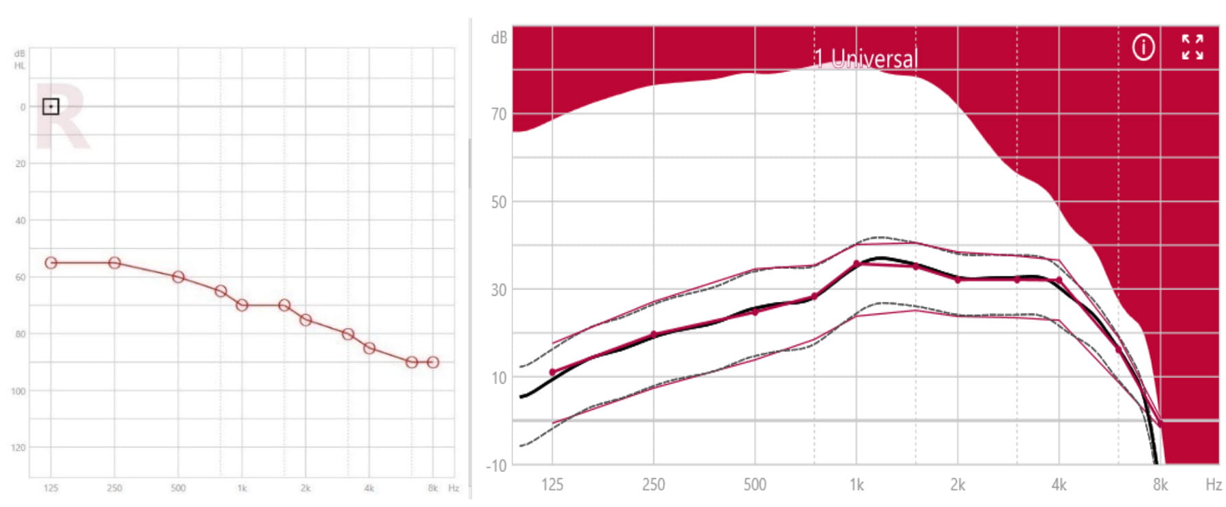Figure 2. Example of a severe hearing loss (left panel) and the corresponding compressive XFit for Motion C&G SP in the insertion gain view (right panel). Target gain curves for different input levels are in red, hearing instrument simulated gain curves are dotted and black. The full-on gain curve shows the maximum insertion gain for 50 dB input level, for given measurement conditions.