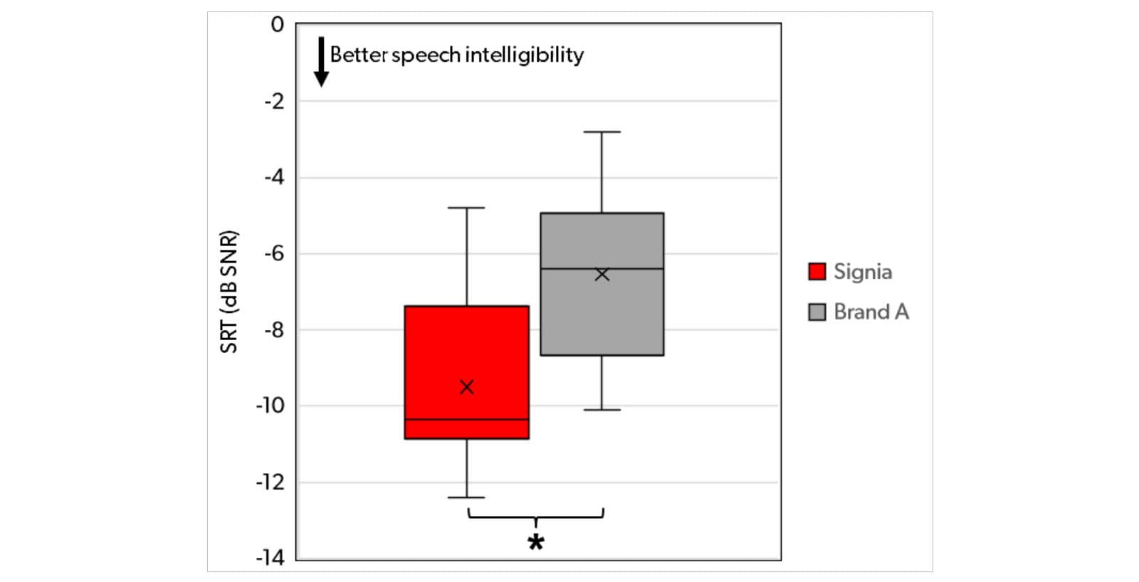 Figure 8 shows substantially better performance (lower SRT) with the Signia device than with the Brand A device. The mean difference is almost 3 dB, and it is statistically significant according to a t-test (t = 4.66, p = .0023). Furthermore, it can be observed that the median SRT for the Signia device is lower than the minimum SRT (best performance) obtained with the Brand A device. That is, half of the participants fitted with Signia performed better than the best performing participant fitted with Brand A. In the given test setup where the distracting noise was presented from the back, the result shown in Figure 8 highlights the superior performance of the Signia directionality, which is designed to optimize speech intelligibility in the most challenging listening situations.
