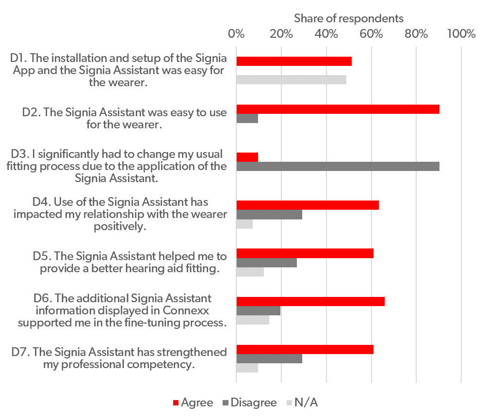 An important feature of Signia Assistant is that the interaction with the wearer—and the changes made to the hearing aid settings during use—are made available to the HCP via Connexx fitting software. This feature allows the HCP to discuss the specific listening experiences that require fine-tuning adjustments when the wearer returns to the clinic. In the survey, 66% of the HCP respondents expressed the information provided by Signia Assistant supported their ability to fine-tune the hearing aids (D6). This is likely one of the reasons why 61% of the HCP respondents agreed that their professional competency had been strengthened as a result of using Signia Assistant (D7).