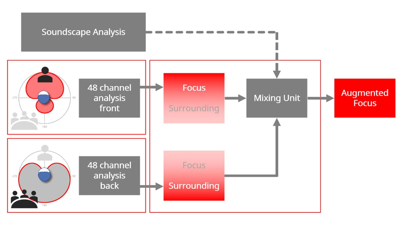 To enable wearers to hear desired sounds, the Focus stream is prioritized in the signal processing mix. By processing sounds in the Focus stream in a more linear manner, Augmented Focus creates a remarkable contrast to the more attenuated and compressed Surrounding stream. This results in the Focus sound being perceived by the wearer as being closer than the Surrounding sound, therefore, augmenting reality, and benefiting the wearer. The mixing of the streams also will depend on the SNR, the acoustic situation that is detected, and whether the wearer speaks and moves while listening. In demanding noisy listening situations, the mixing unit also can activate binaural beamforming in the front stream.