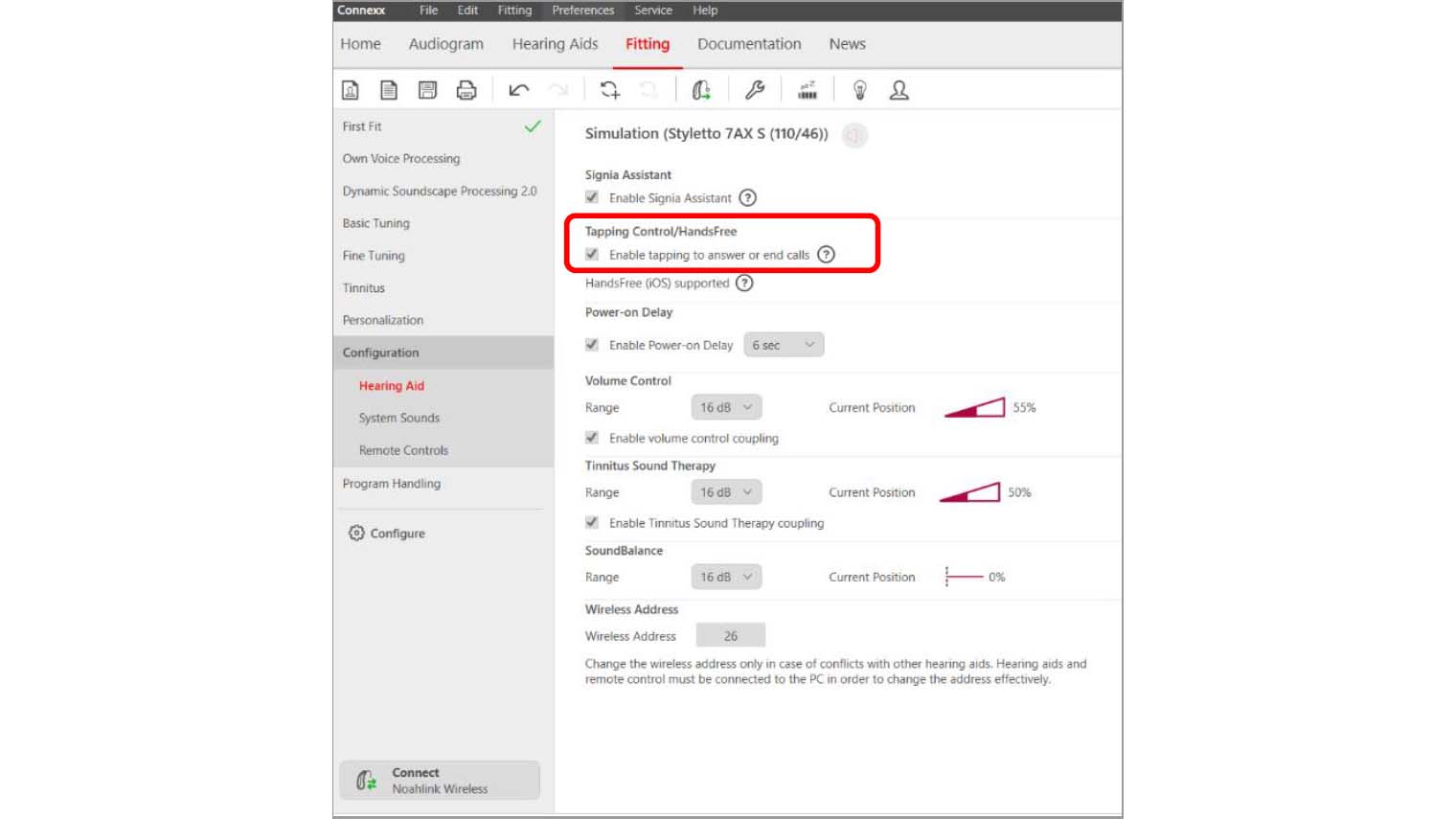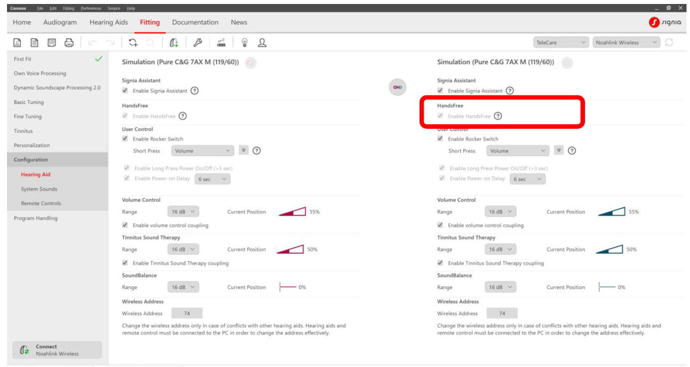 You can see that HandsFree is available in the Configuration Section under the Hearing Aid tab (Figure 1).
