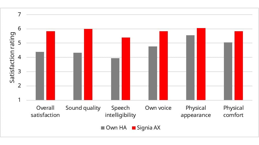 Figure 3. The mean ratings of satisfaction with Signia AX and own hearing aids, averaged across all participants. Both overall satisfaction with the devices and satisfaction within five specific domains were rated.