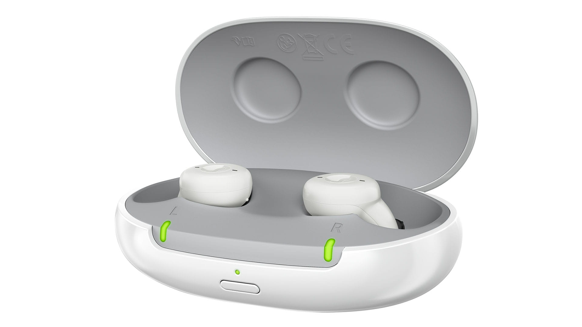 Three LEDs per hearing aid indicate their charging status and an additional LED indicates the cleaning status.