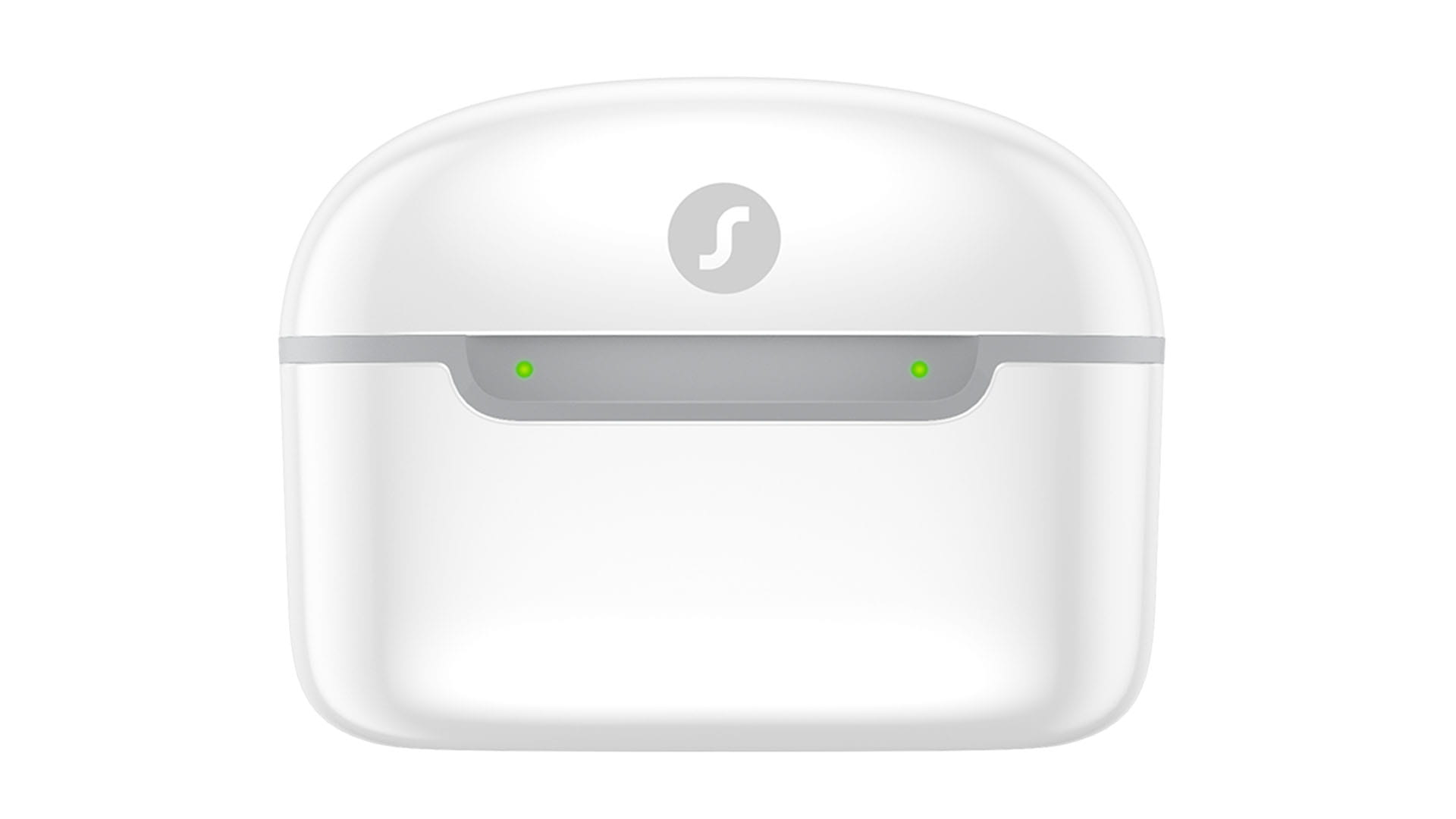 Cargador de bolsillo con batería integrada que puede proporcionar hasta tres cargas completas antes de necesitar recargarse. Los LED indican el estado de carga de cada audífono y de la batería integrada. Puede cargarse de forma inalámbrica (Qi).