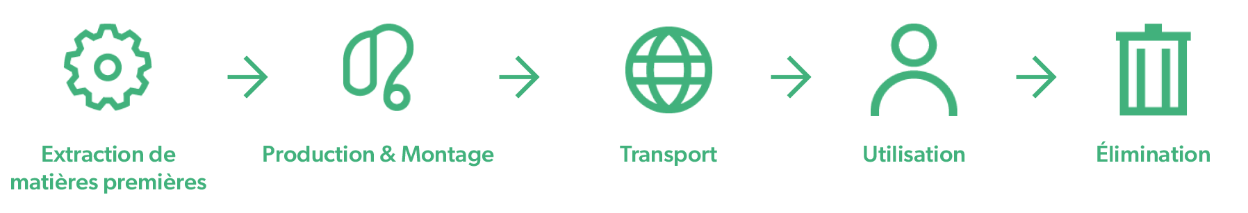Pour pouvoir évaluer l'écobilan d'un produit de manière complète, il faut considérer l'ensemble des impacts environnementaux du cycle de vie d'un produit. En économie, cette analyse du cycle de vie est appelée "principe Cradle to Grave" (en français : "du berceau à la tombe"). Voici un aperçu des cinq phases du cycle de vie des produits :