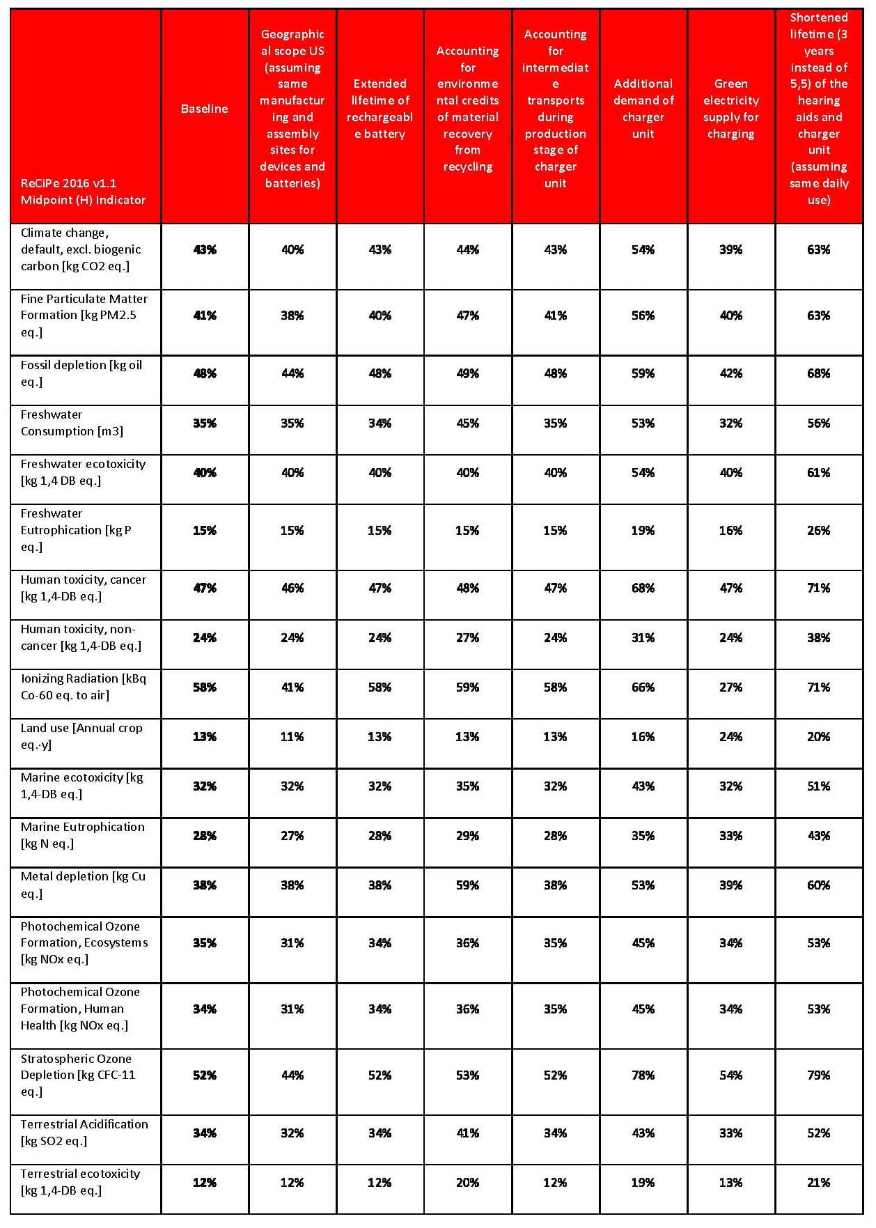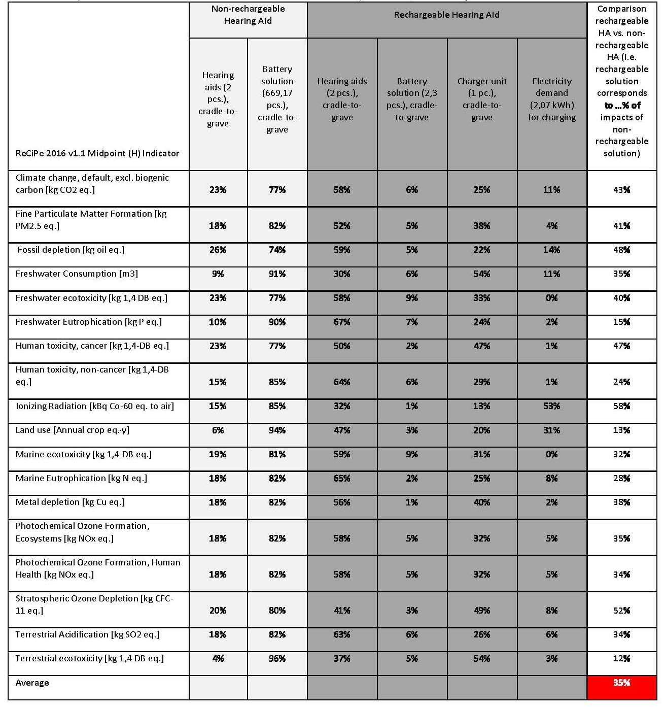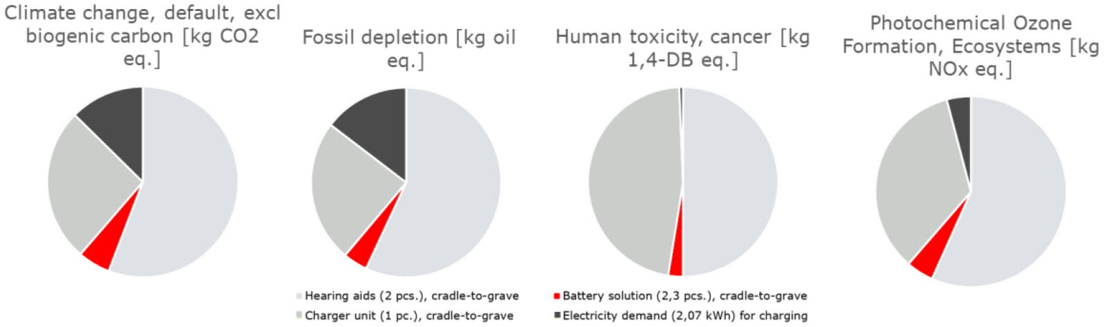 - La solution d’aide auditive rechargeable permet d’économiser les impacts environnementaux dans les 18 catégories différentes, y changement climatique, l’émission de particules fines, l'épuisement des énergies fossiles, la consommation d'eau douce, l'écotoxicité de l'eau douce, l'eutrophisation de l'eau douce, la toxicité cancérigène et non-cancérigène pour l’homme , les radiations ionisants, la pollution des sols, l'écotoxicité aquatique, l'eutrophisation aquatique, la raréfaction des métaux, la création d'ozone photochimique, les écosystèmes, la santé humaine, la destruction de la couche d’ozone, l'acidification via le sol et l'écotoxicité via le sol.