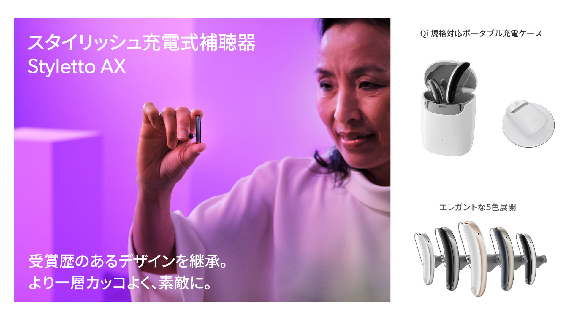今回発売されるStyletto AXは、シグニアの代表的な製品の一つであるStylettoの最新器種です。世界中で数々のデザイン賞を受賞したスタイリッシュなデザインを継承しつつ、シグニア最先端音声技術Signia AXテクノロジーを搭載。Qi規格対応のポータブル充電ケース付きで、外出先でもすぐに充電可能。デザインも機能も、使い勝手も兼ね備えた充電式補聴器です。