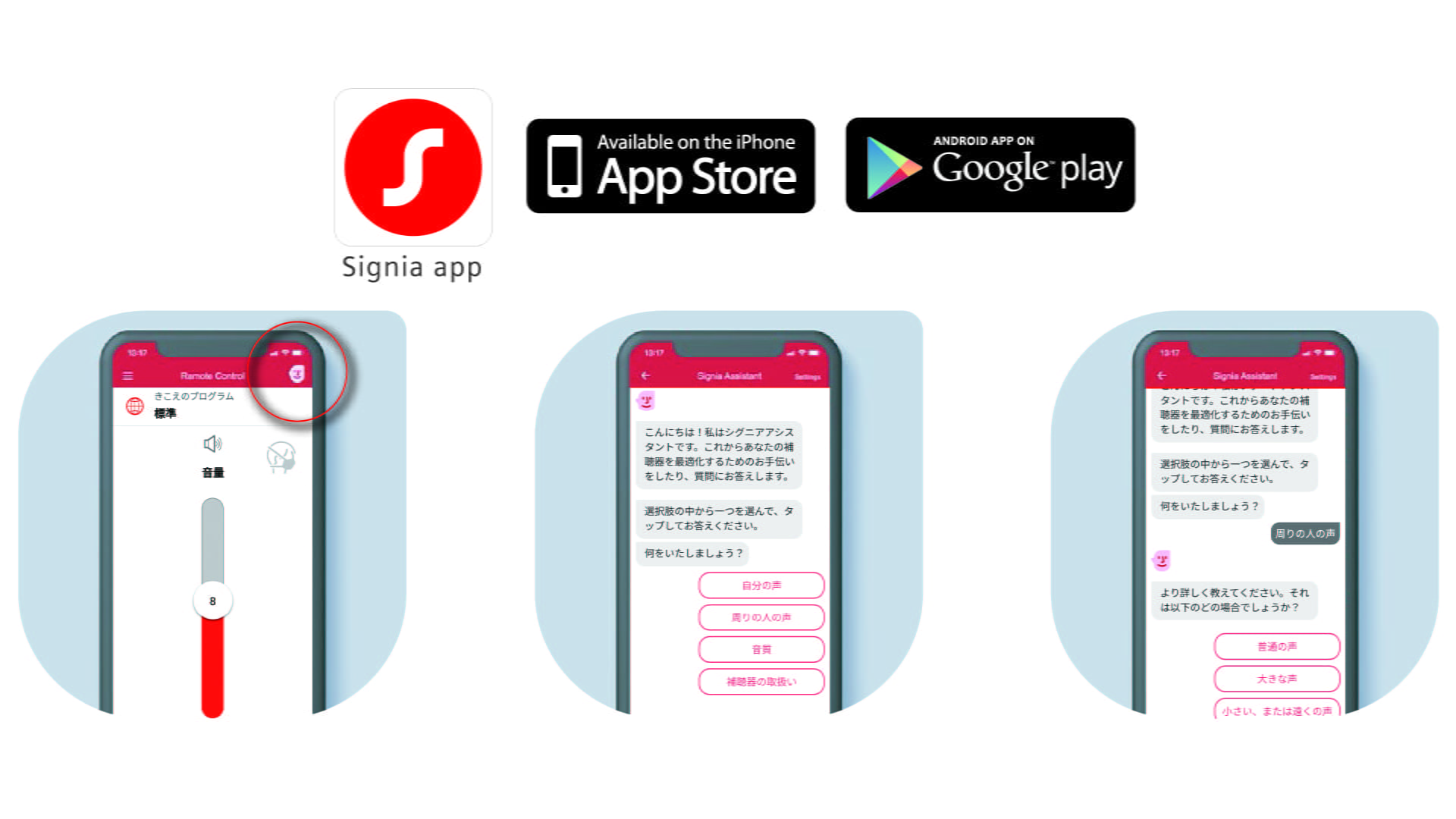 シグニア無料提供のスマートフォンアプリ「Signia app」(シグニア アプリ)に搭載されている「Signia Assistant」を使用し、使用者が自分で補聴器を調節することが可能に。「Signia Assistant」と対話形式でやりとりするだけで、音量や音質、周りの音の聞こえ方を、使用者の好みと環境にあった調節が可能。※5