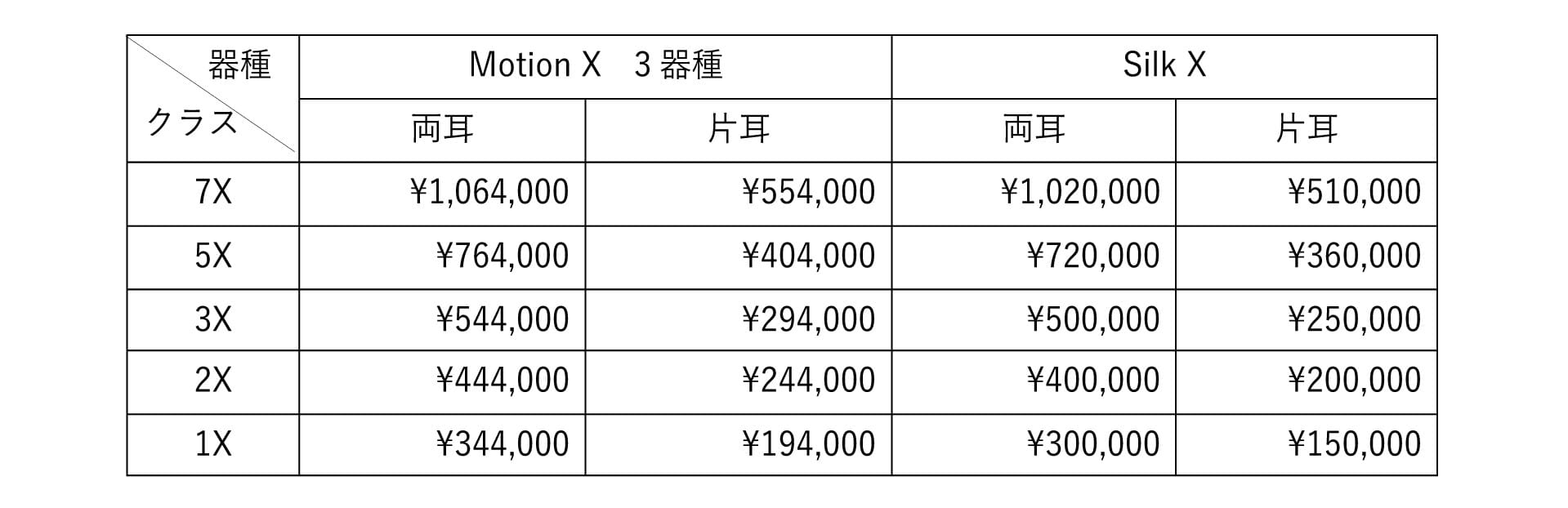 ※6 掲載価格は希望小売価格です。Motion X 3器種は補聴器本体(非課税)、充電器1台¥44,000(課税・税込)を一式にした価格です
