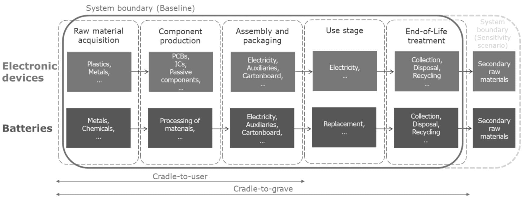 Alle livsløpstrinn (fra vugge til grav) for de undersøkte produktsystemene er inkludert i denne vurderingen. Livsløpstrinn eller enkelte prosesser som er identiske for begge alternativer, kan imidlertid bli ekskludert fra denne sammenligningen. I denne vurderingen ble systemgrenser angitt for de to høreapparatløsningene og batteriene, noe som gjør det mulig å sammenligne de to systemene og deres likeverdige funksjon. I denne sammenhengen var det viktig å innlemme produksjonsprosesser, bruksfaser og levetidsscenarioer for hver løsning. Prinsippene for systemgrensebetingelsene er angitt i grafikken under.