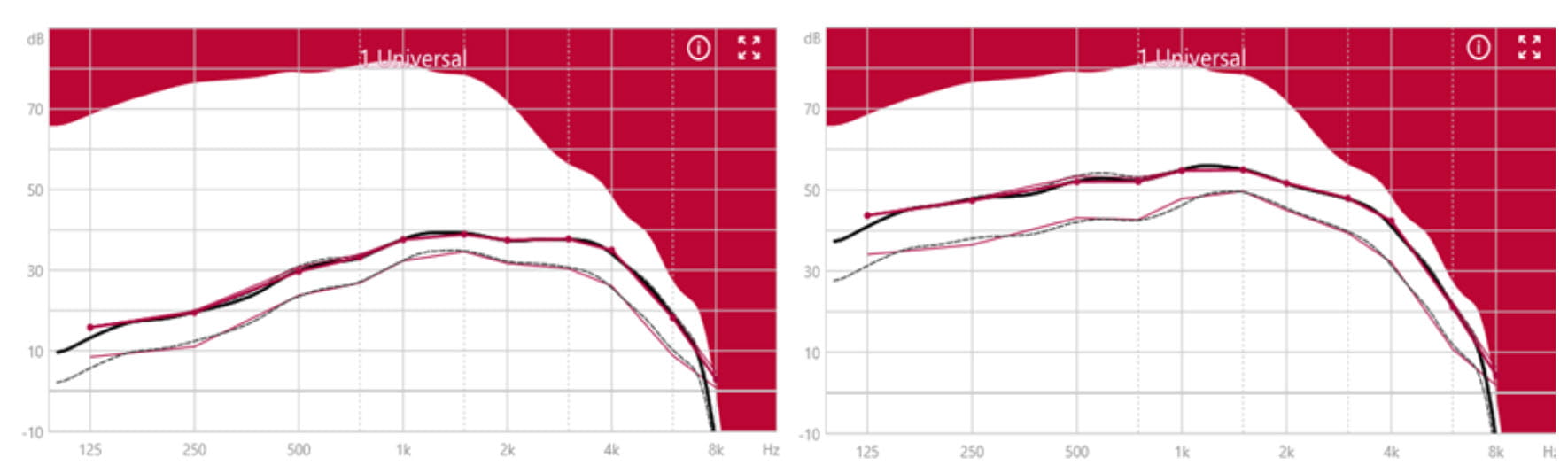 Figure 2. Example of a severe hearing loss (left panel) and the corresponding compressive XFit for Motion C&G SP in the insertion gain view (right panel). Target gain curves for different input levels are in red, hearing instrument simulated gain curves are dotted and black. The full-on gain curve shows the maximum insertion gain for 50 dB input level, for given measurement conditions.